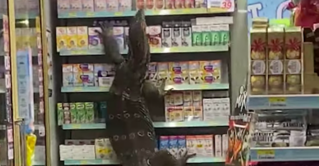 Sí, es real. En un video que se está haciendo súper viral, vemos a un lagarto gigante escalando los estantes de un 7 Eleven en Tailandia.
