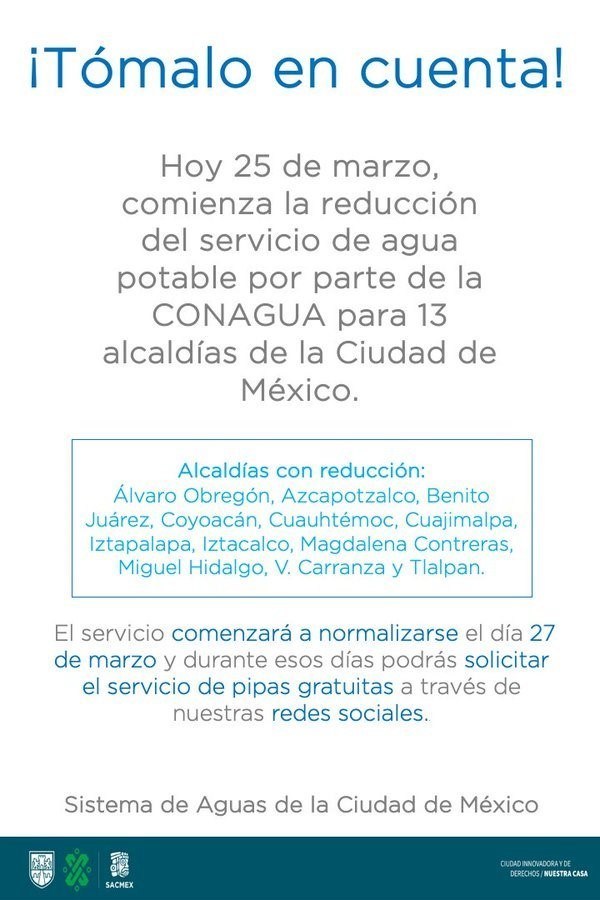 El Sistema de Aguas de la Ciudad de México informó que el servicio comenzará a normalizarse el 27 de marzo pero durante estos dos días la población podrá solicitar el servicio de pipas gratuitas a través de las redes sociales.
