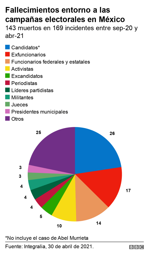Tanto el estudio de Integralia como el de otra consultora, Etellekt, muestran que la violencia ha causado muertes en todos los niveles de la política: candidatos, activistas, funcionarios activos y exfuncionarios, líderes partidistas y hasta militantes de partidos.