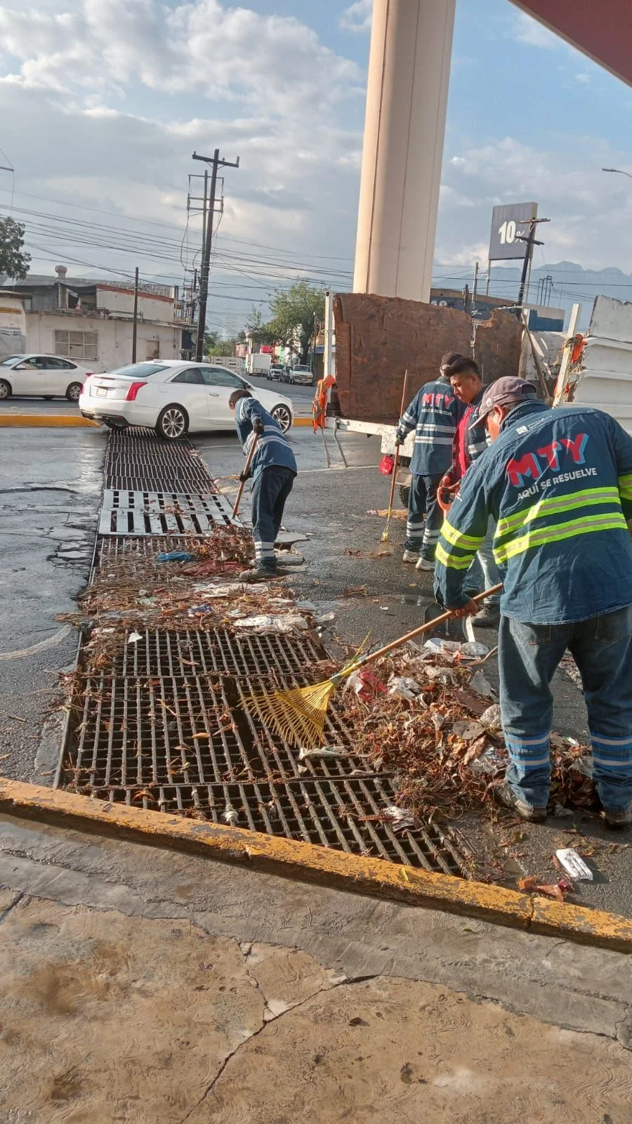 A lo largo de la ciudad el Gobierno de Monterrey desplegó durante la madrugada y esta mañana cuadrillas de trabajadores de Servicios Públicos para la limpieza de parrillas con el fin de evitar encharcamientos en calles y avenidas.