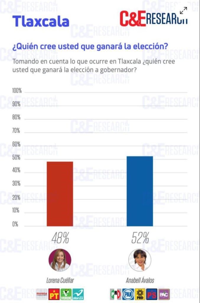 La candidata al Gobierno de Tlaxcala por la coalición PRI, PAN, PRD, PAC y PS, Anabell Ávalos Zempoalteca, se afianza como la favorita en las preferencias del electorado con un 46% en intención del voto, según la última encuesta de C & E Research.